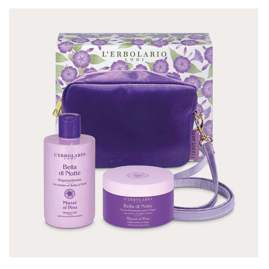 In questa raffinata pochette viola sono custoditi due cosmetici della linea Bella di Notte essenziali per la cura del corpo: il Bagnoschiuma e la Crema idratante profumata dalle note fiorite e vanigliate. Il kit è una perfetta idea regalo da donna, adatta a ogni occasione.